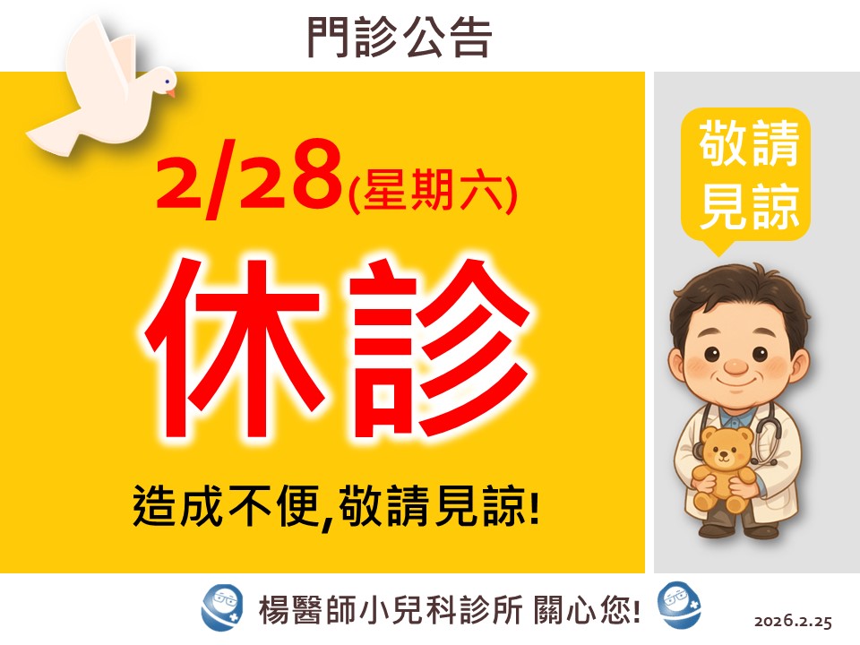 2/28(六)休診一日 分類:eggyliver2026 年 2 月 25 日發表於最新公告 📢 休診公告 楊醫師小兒科診所因應 115/2/28(星期六)和平紀念日,👉 休診一日 造成不便,敬請見諒,請家長們提前安排就診時間。 楊醫師小兒科診所 關心您 ❤️ 分享此文: 分享到 X(在新視窗中開啟) X 分享到 Facebook(在新視窗中開啟) Facebook 喜歡 正在載入... 相關