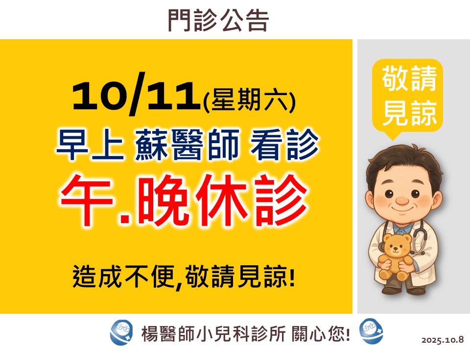 10/11(星期六)早上蘇醫師看診,午晚休診,造成不便,敬請見諒!