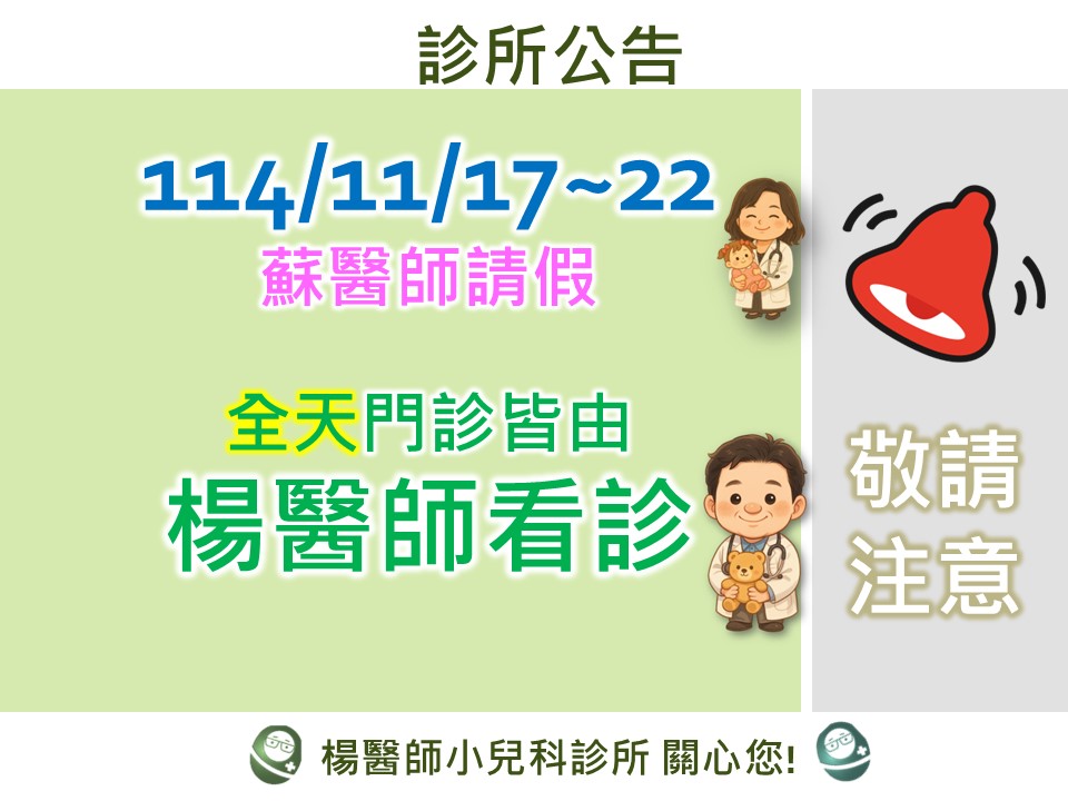 ❗❗公告❗❗ 11/17-11/22蘇醫師請假.全日門診由楊醫師看診,敬請見諒! 楊醫師小兒科診所 關心您!