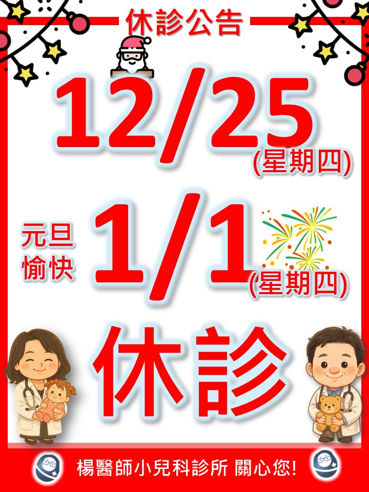 ❗❗公告❗❗12/25(星期四)及1/1(星期四)休診,祝大家佳節愉快!楊醫師小兒科診所 關心您!