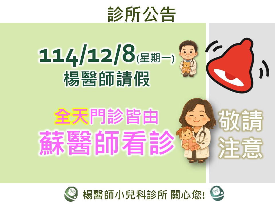 12/8(星期一)楊醫師請假,整日由蘇醫師看診,造成不便,敬請見諒! 楊醫師小兒科診所關心您!!