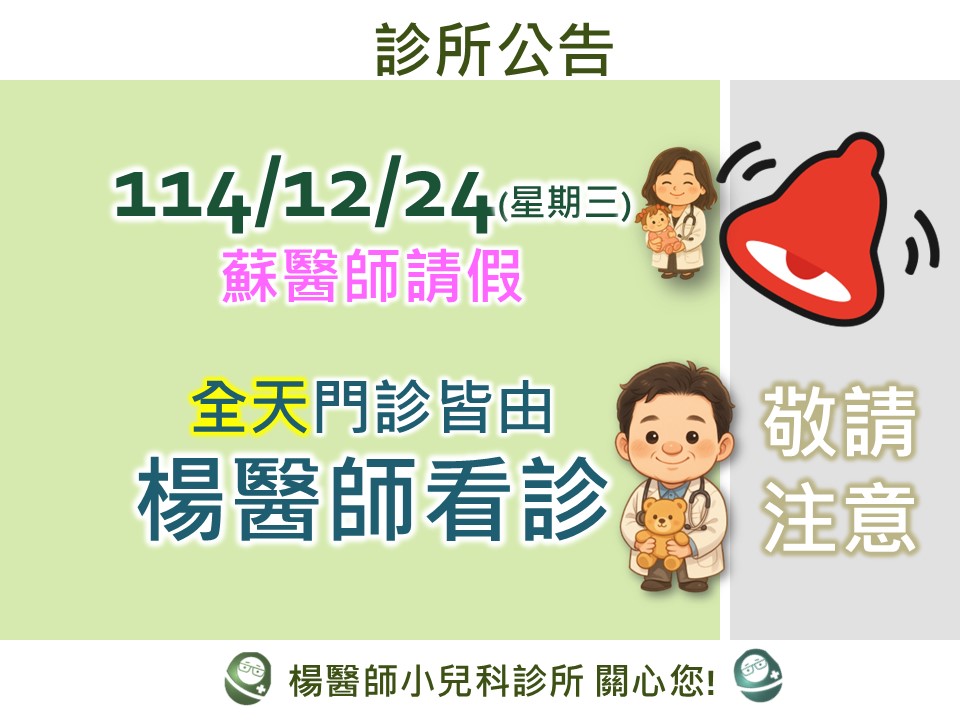 12/24(星期三)蘇醫師請假,整日由楊醫師看診,楊醫師小兒科診所關心您!!