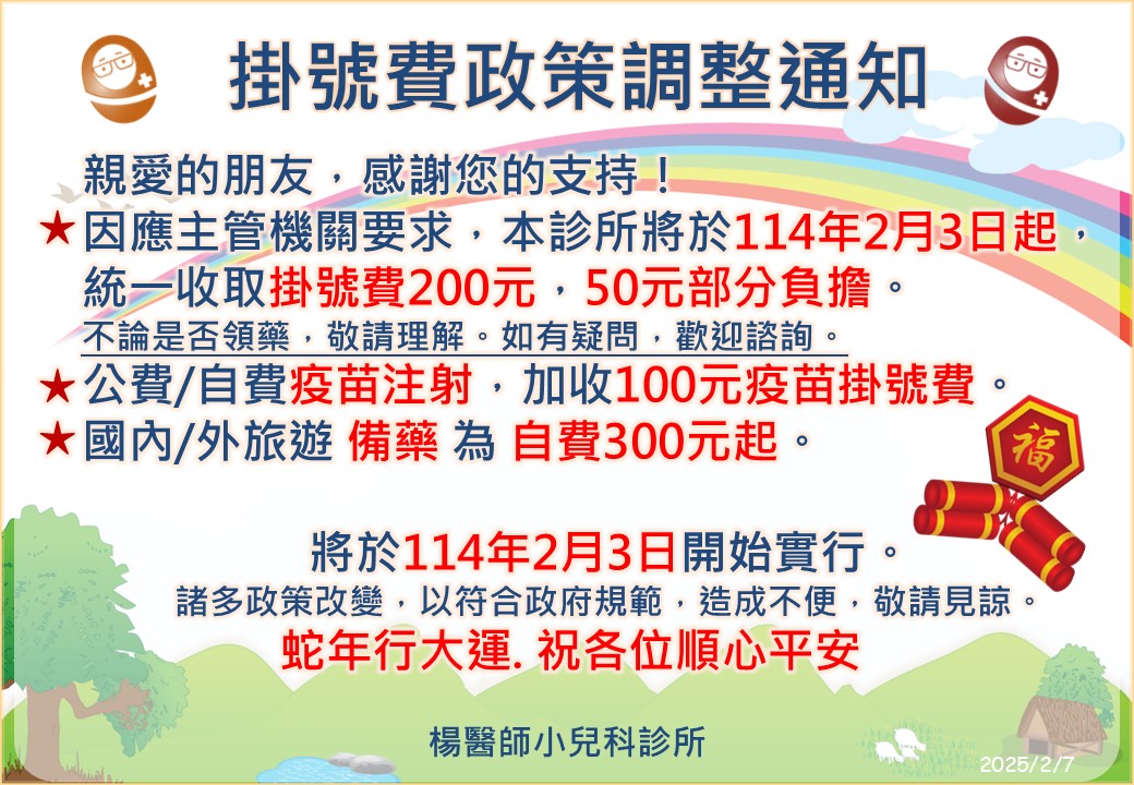 診所掛號費政策調整通知,造成不便,敬請見諒! 楊醫師小兒科診所