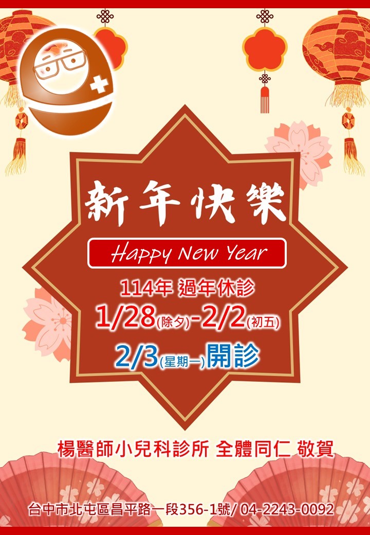 114年過年休診-1/28(除夕)-2/2(初五),2/3星期一開診,祝大家新年快樂!! 楊醫師小兒科診所 敬繼續閱讀 “114年過年休診公告"
