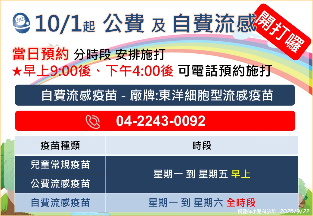 113年流感疫苗開打囉!! 楊醫師小兒科診所關心您!