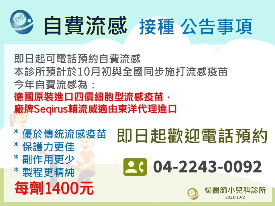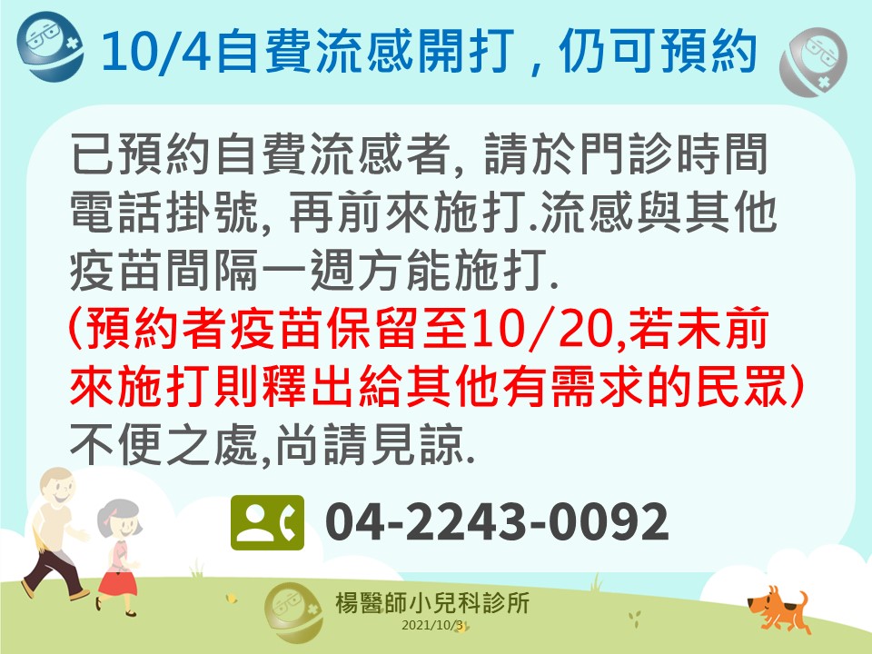 已預約自費流感者, 請於門診時間電話掛號, 再前來施打.流感與其他疫苗間隔一週方能施打. (預約者疫苗保留至1繼續閱讀 “10/4自費流感開打 , 仍可預約"